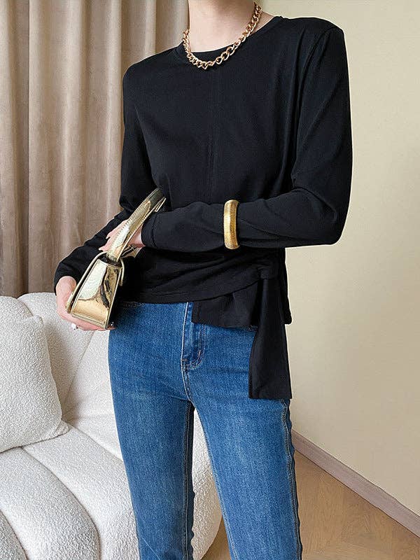 Long Sleeves Asymmetric Bowknot Solid Color Round-Neck T-Shirts Tops: BLACK / One_size