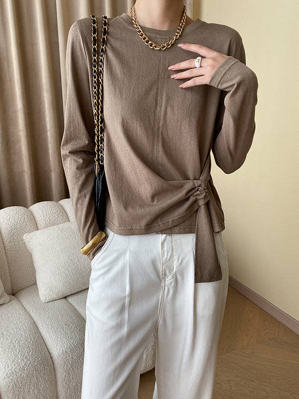 Long Sleeves Asymmetric Bowknot Solid Color Round-Neck T-Shirts Tops: COFFEE / One_size