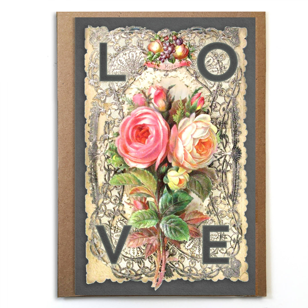 Beautiful Vintage Valentine; LOVE with flowers over lace