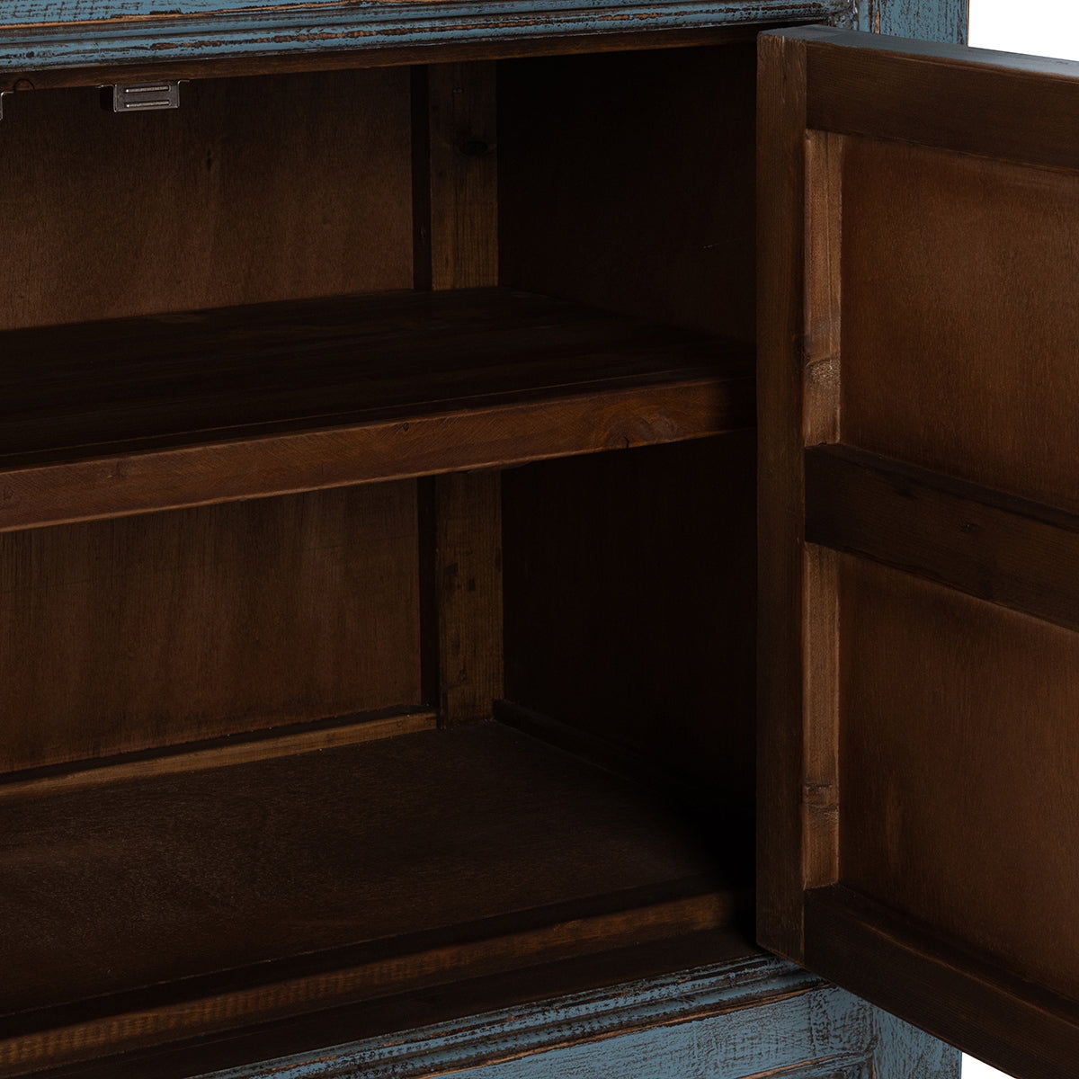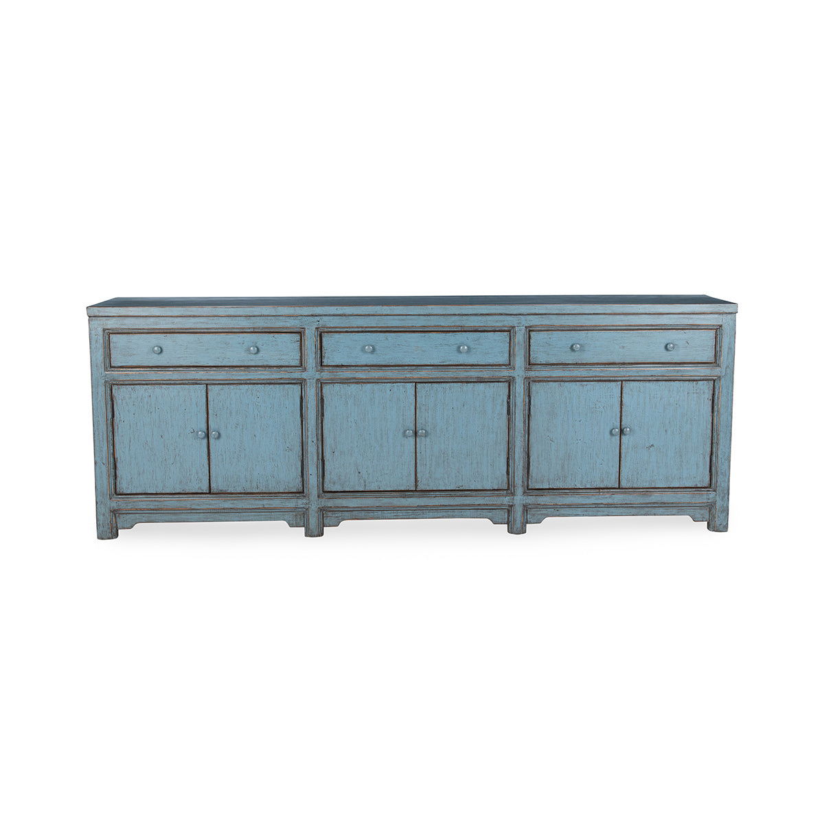 Bring a global style home with the Montgomery buffet. Inspired by Chinese antiques, features molding details, a distressed blue finish, three drawers, and cabinet space, blending nostalgic charm with functional storage.