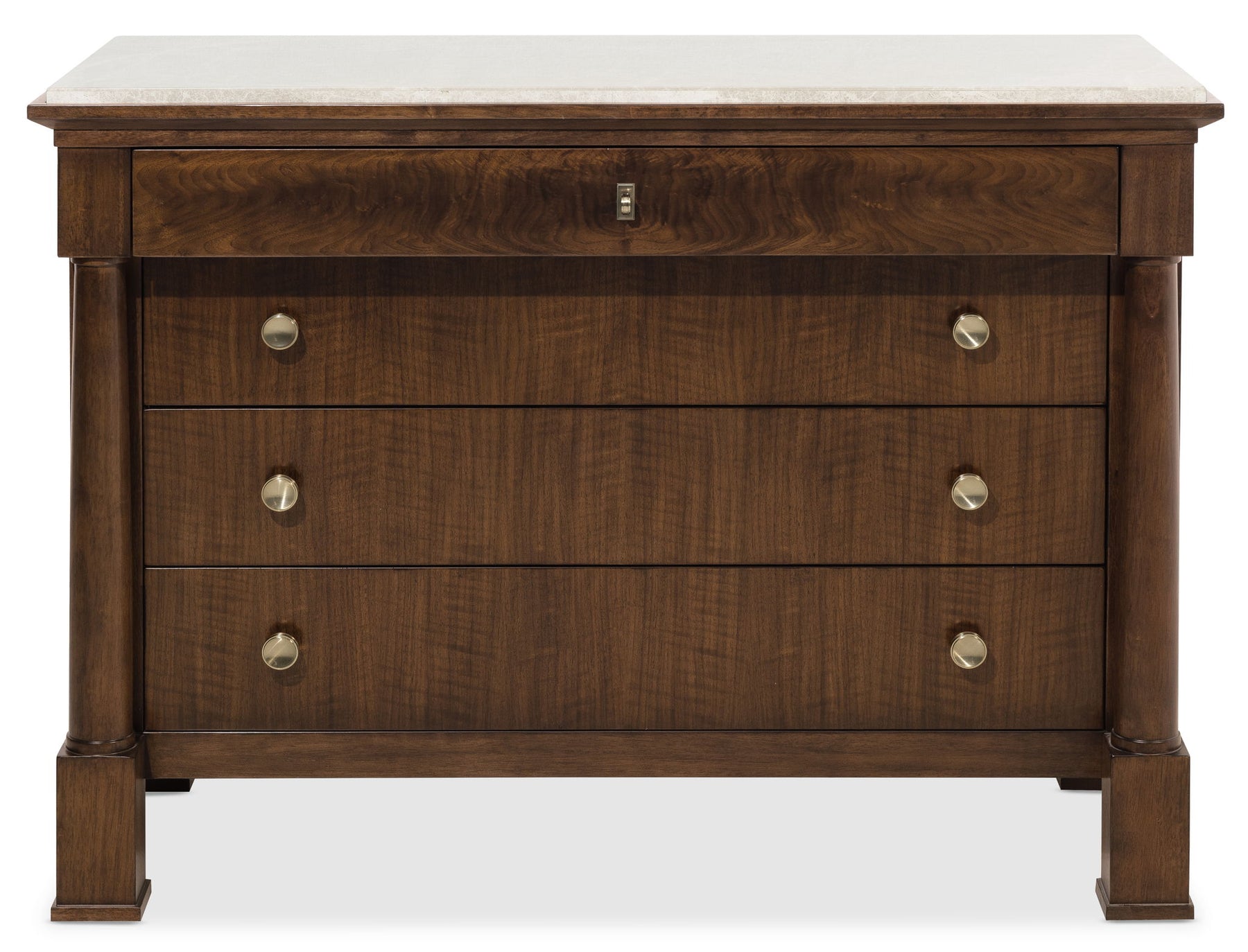 Add practical elegance to your bedroom with the Archives Four-Drawer Chest. Crafted with a Classic Walnut finish over figured quartered walnut veneers, this chest exudes timeless charm. It features four drawers, including cedar-lined bottom drawers, and is topped with a Castle Grey marble surface. The custom satin brass hardware completes the luxurious look of this beautifully designed chest.