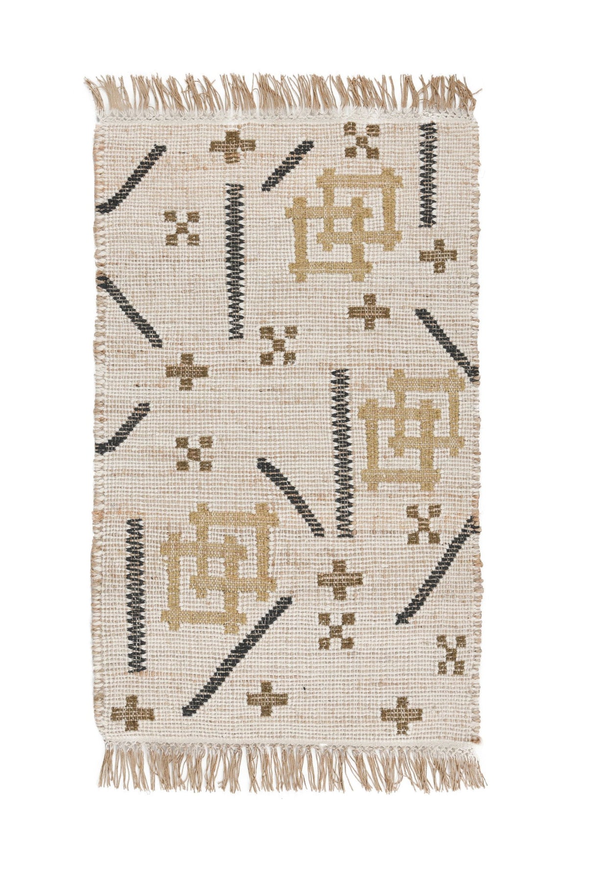Reminiscent of traditional patterns, this handwoven rug features a sustainable blend of wool, jute, and cotton. Dyed cotton fringe softens each edge while contrasting, natural hues bring an organic vibe to the geometric pattern.
