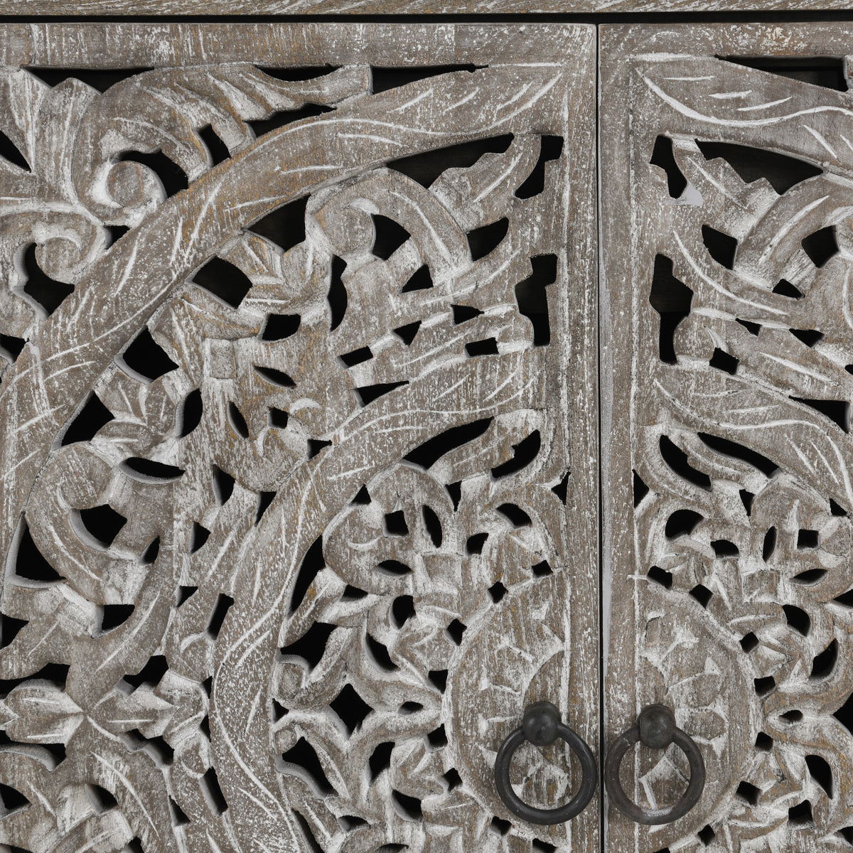 Elevate your space with this exquisite 4-door mango wood sideboard, featuring intricately hand-carved floral panels that blend artistry with function. The rich finish highlights the natural grain, while antique-style ring pulls add a refined touch. Offering generous storage behind four beautifully detailed doors, this artisan sideboard is perfect for dining rooms, entryways, or living spaces. A timeless piece for those who value craftsmanship, global design, and elegant statement furniture.
