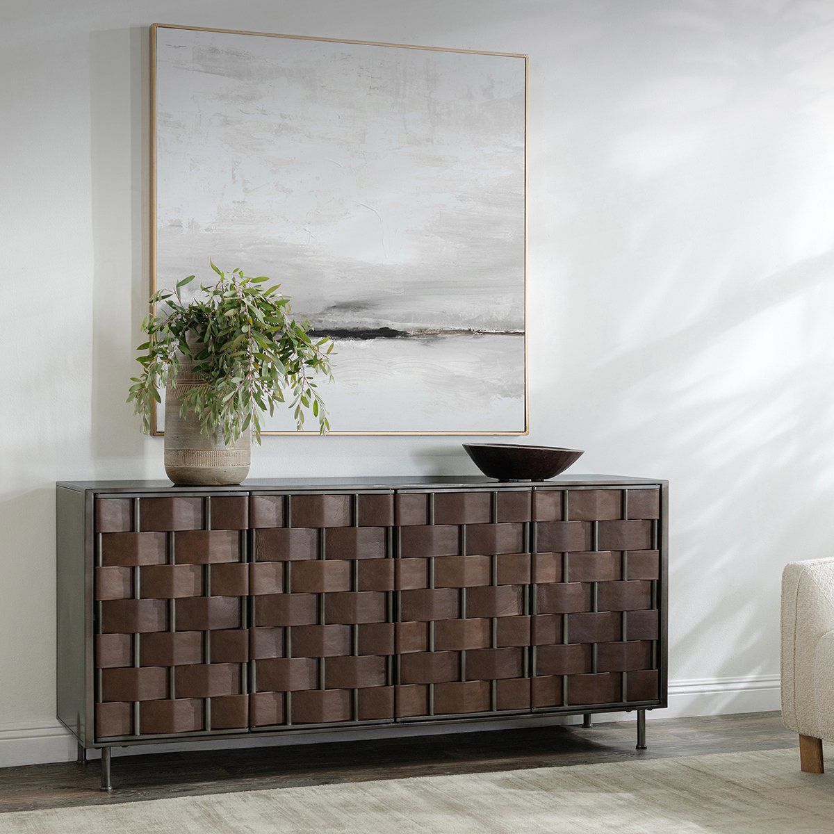 The Komo Leather/Metal Cabinet blends craftsmanship with modern design. Top-grain leather, with an intricate basket weave pattern, adds warmth and sophistication, while the sturdy steel iron body ensures durability. The sleek metal frame brings a contemporary flair, making this versatile piece a bold yet refined addition to any space.