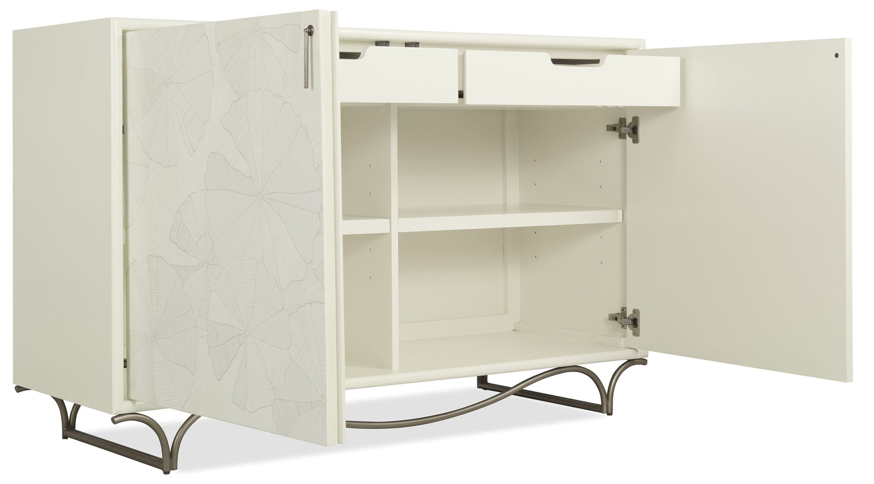 An ode to organic elegance, this chest showcases intricate lily pad marquetry over a soft white painted finish. With inner storage and a leafed metal base, it brings an artisan-crafted focal point to refined spaces.