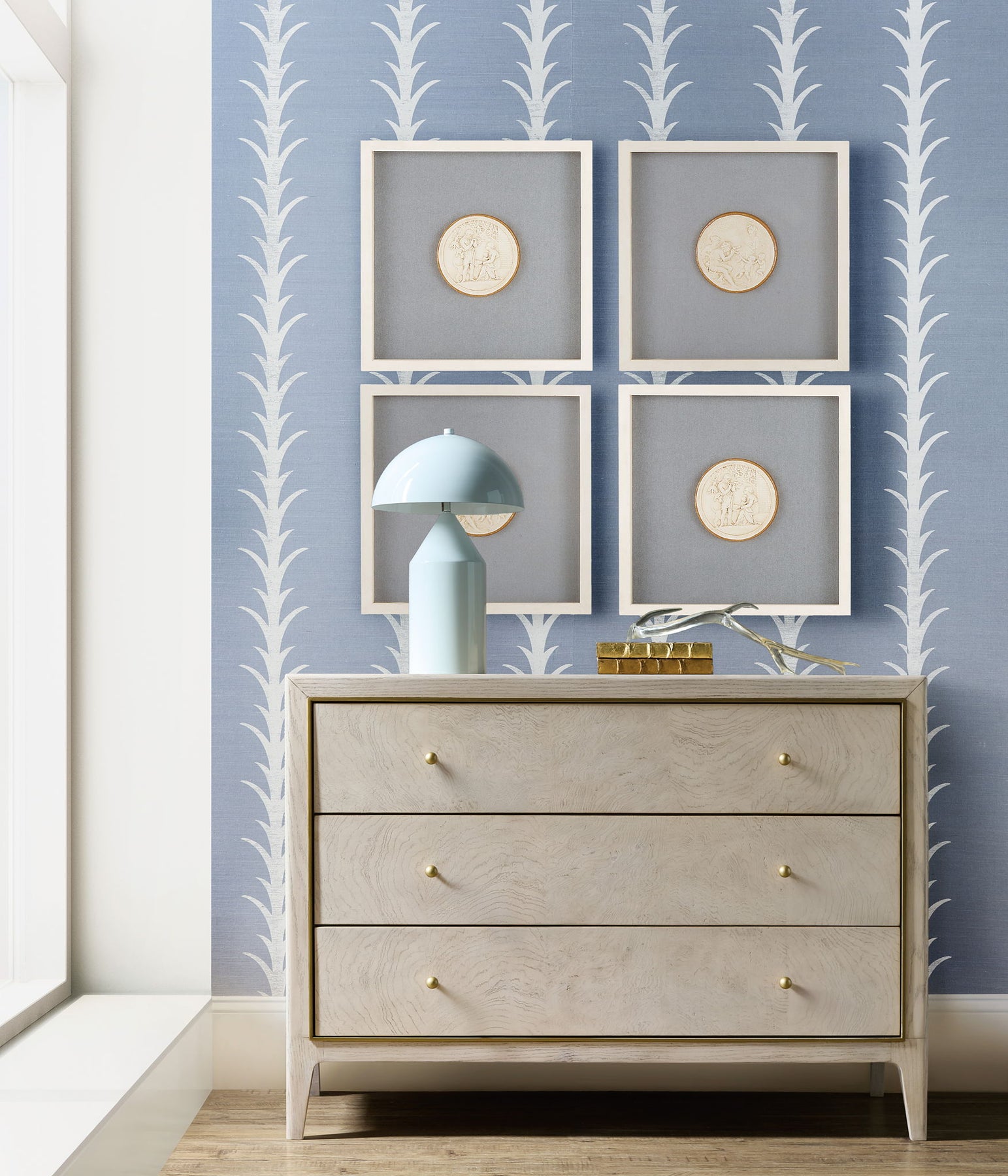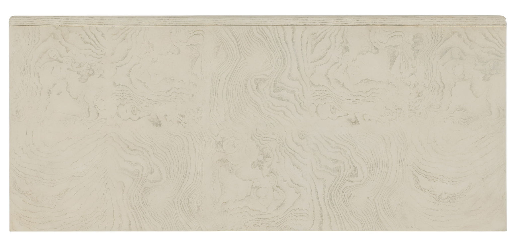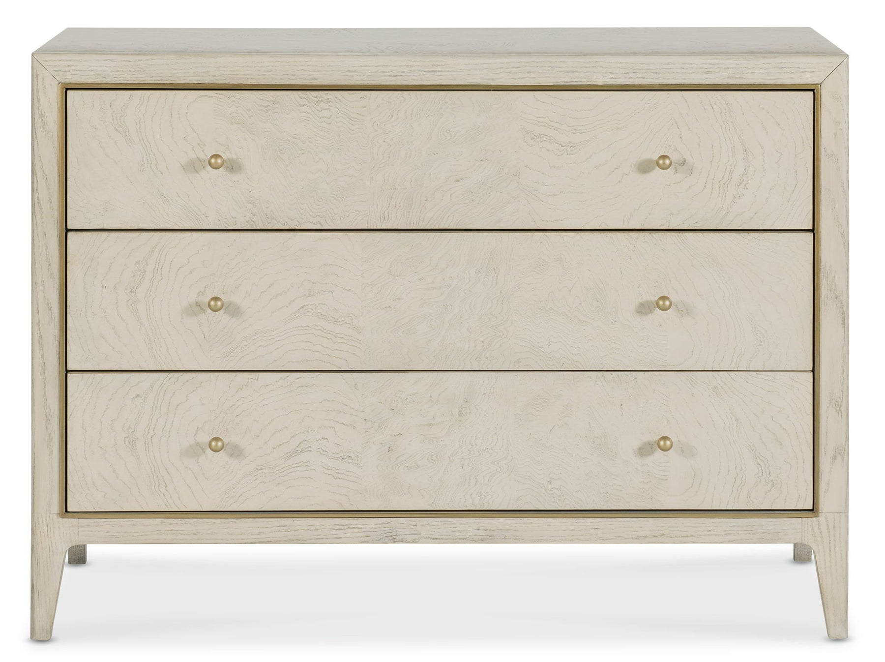 A blend of romantic curves and refined finishes, the Wonderlust Chest is crafted from ash burl veneers in a light greige hue, accented by gold trim and tapered legs. Three self-close drawers make it as practical as it is beautiful.