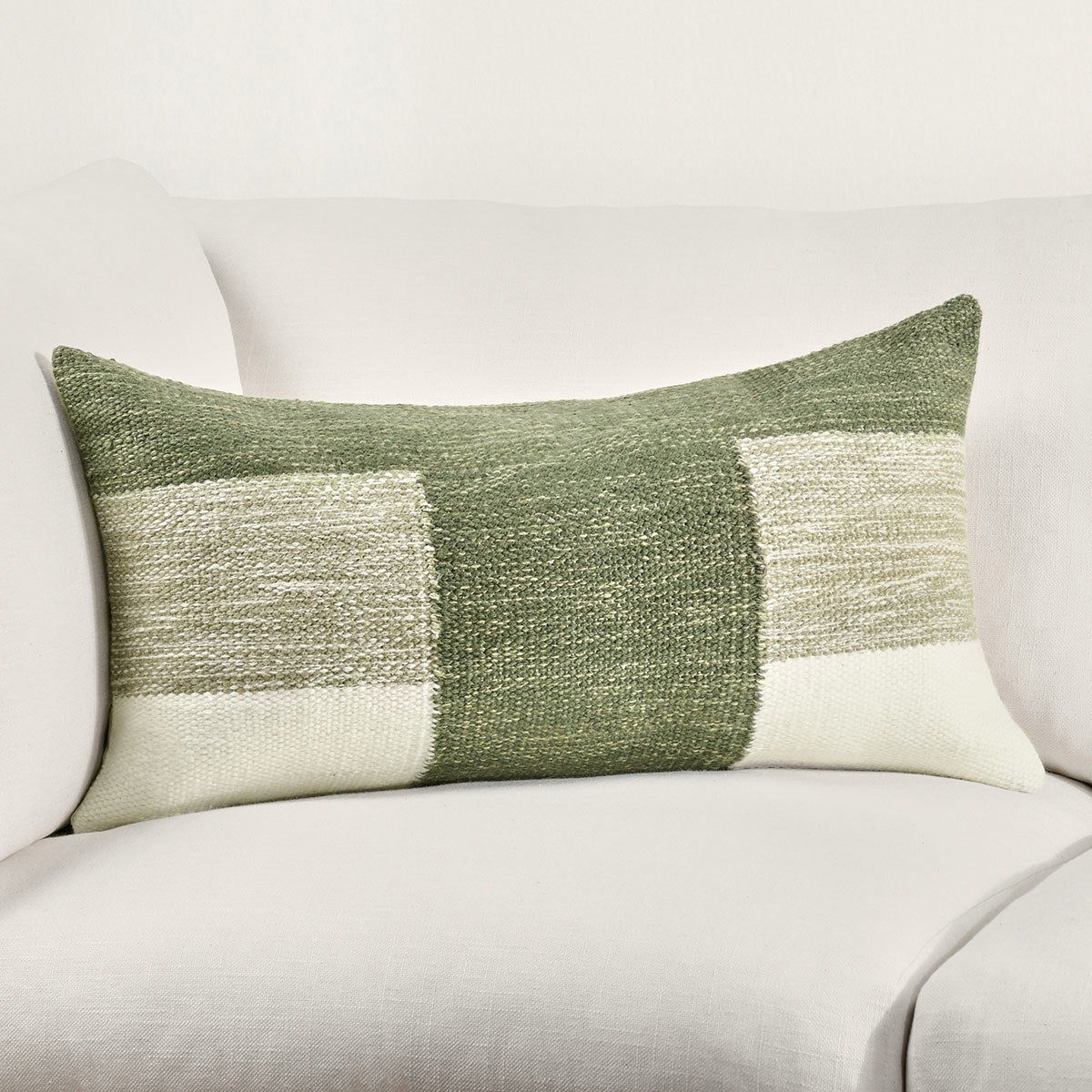 With its woven color-blocked design, this pillow combines steely shades for a fresh, modern look. Add this versatile pillow to any room for a soothing, airy effect with soft texture. A feather blend insert adds a premium feel.