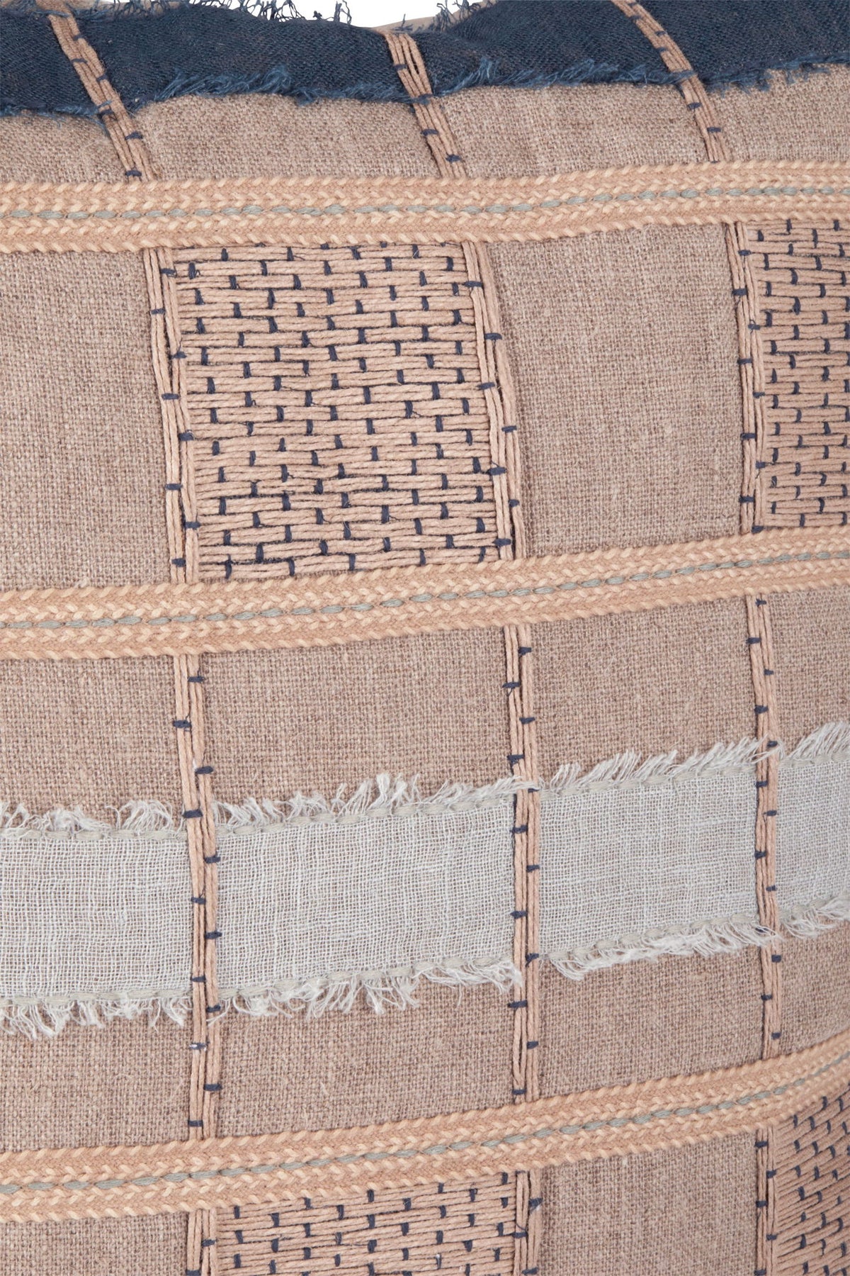 Complete your coastal oasis with this multicolored pillow crafted with stripes and squares. Hand-cut and appliqued linen with frayed edging softens the lines in the geometric pattern while embroidery and rope add texture.