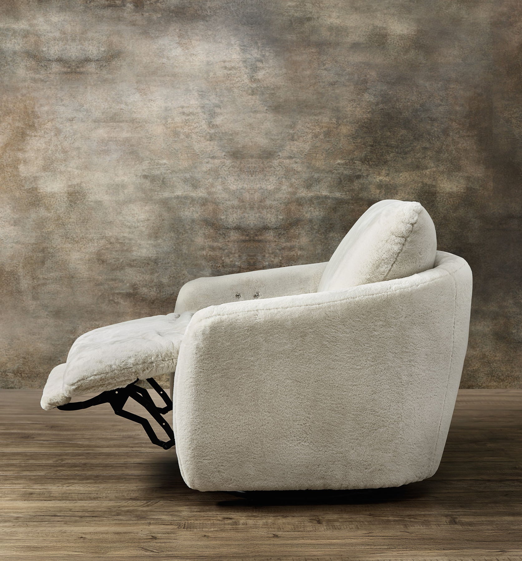 The Bonnie Swivel Chair features a petite, modern design with the added luxury of a power footrest. Upholstered in soft, faux fur fabric, it provides ultimate comfort while maintaining a sleek and stylish appearance. Ideal for cozy living spaces, this chair blends style, comfort, and functionality effortlessly.