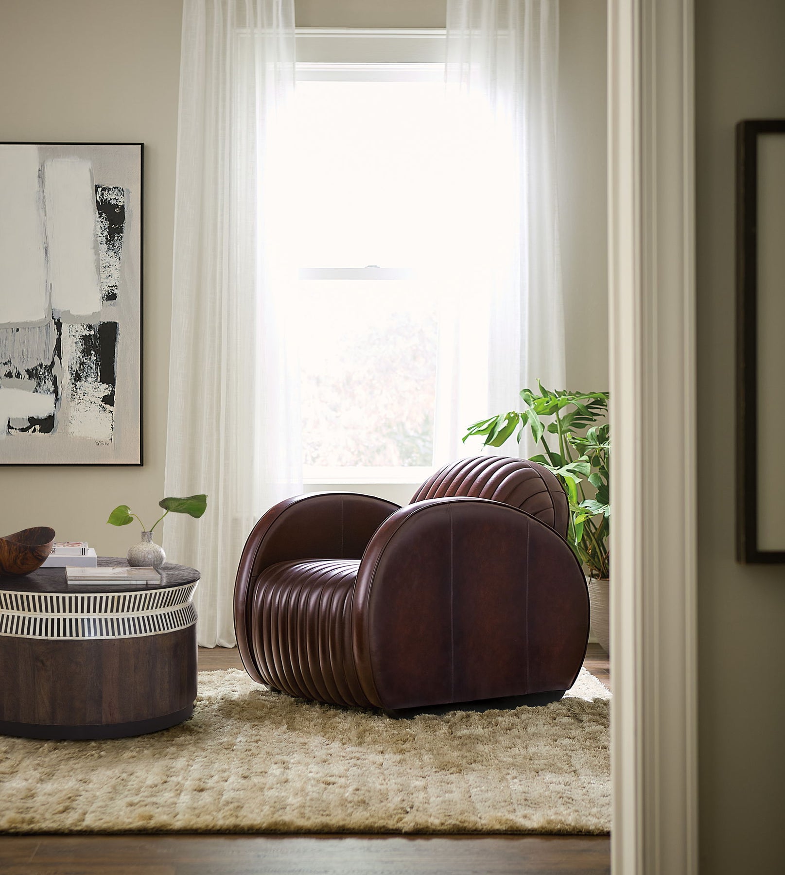 In a bold modern design with an Art Deco flair, the Banks Chair has a plush channeled back and seat and rounded track arm style with wood sled feet. Welt and topstitch trim adds an upscale feel, along with the Vortex semi-aniline top grain leather.