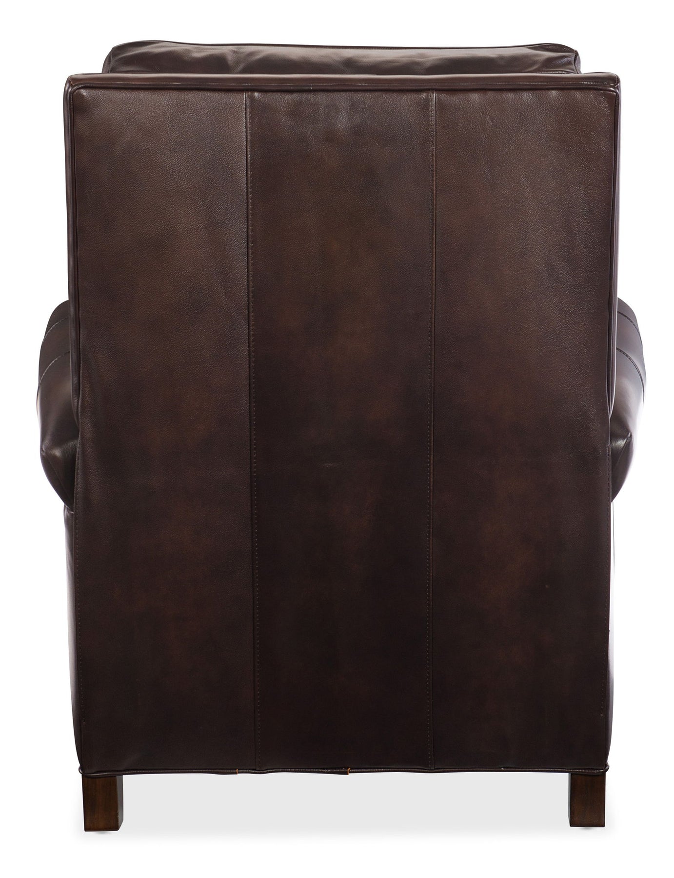 Relax in classic style in the designer-friendly Conlon Recliner, a refined club chair silhouette covered in plush Semi-Aniline Top Grain Leather in a rich brown color and wood trimmed in the Sedona Chateau finish. Nailhead trim and shaped spool feet add a decorator touch. Simply push on the arms to recline in effortless relaxation.