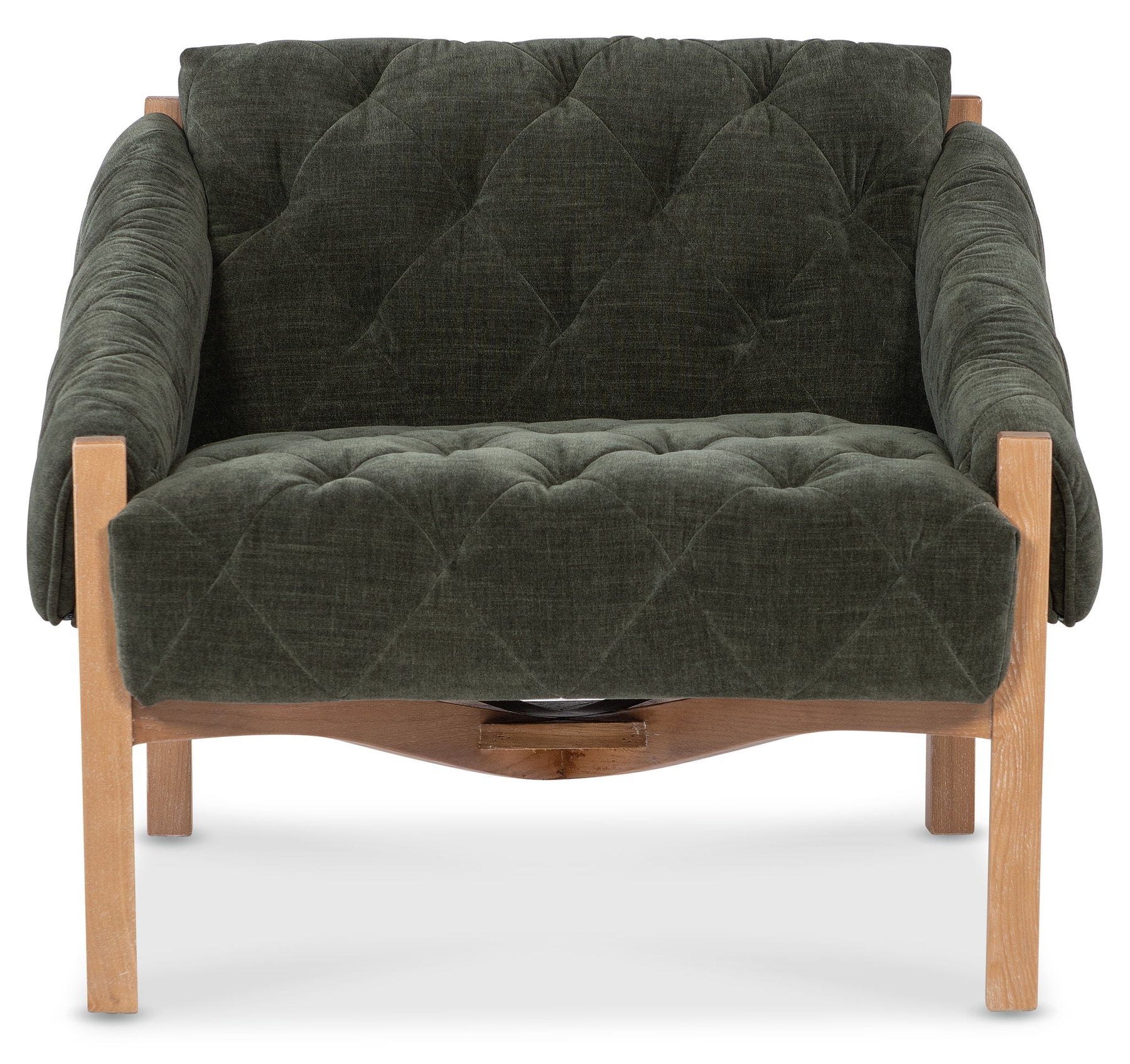 The Kerns Accent Chair in Ansel Rain Forrest velvet brings a vibrant pop of green to any room. Its modern transitional design features diamond tufting and a decorative wood frame, offering both comfort and durability. Perfect for living rooms or bedrooms, this chair makes a bold and stylish statement.