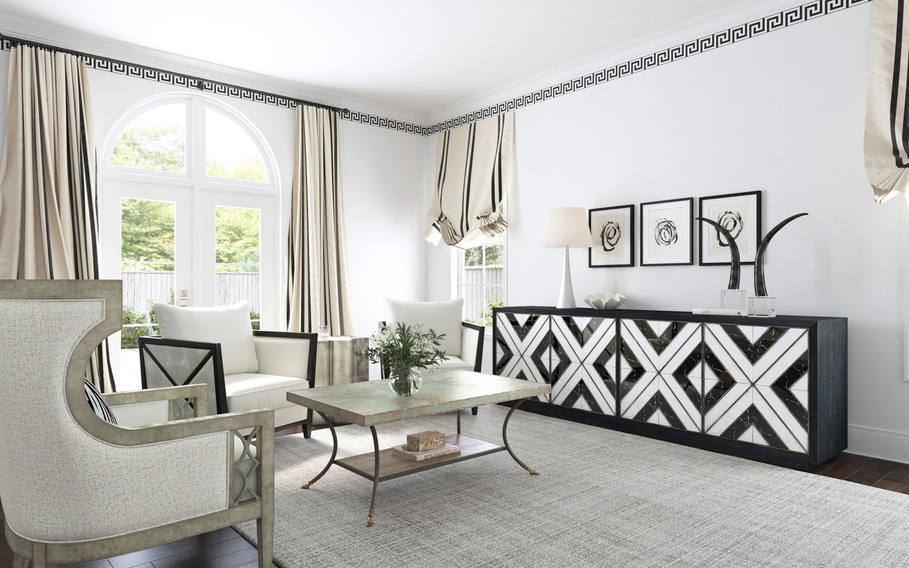 She's a modern gal: up to date and sumptuously scaled. The Sanctuary Debutant Wing Chair has a classic pedigree in historic traditional and has been streamlined and modernized. A true style statement, the Debutant shows off three different performance fabrics: The inside back and seat is in Celestial Ice, and the outside back is in Sequins Pearl, while the pillow is in a zebra print for extra fun.