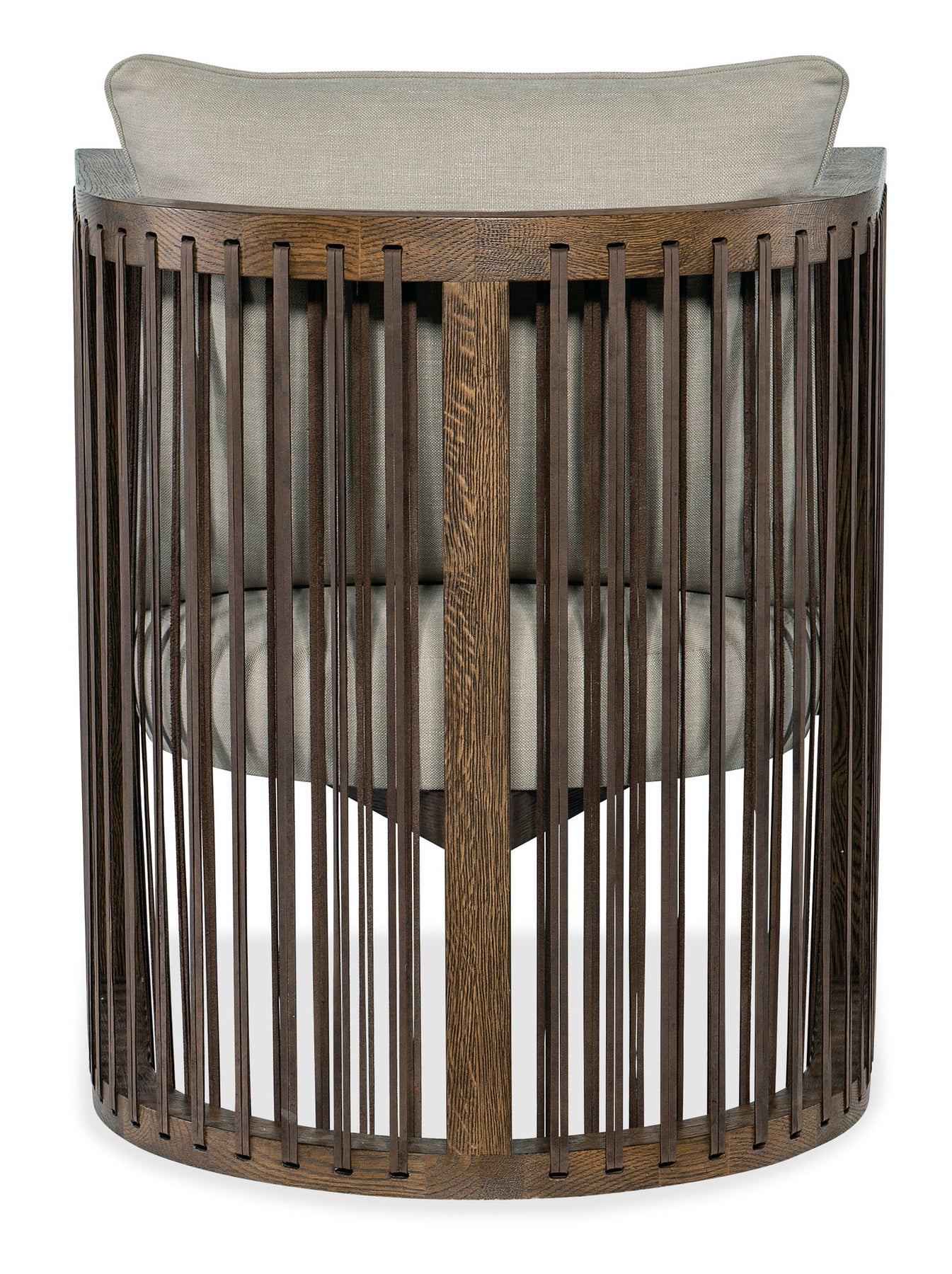 Modern, sophisticated and organic, the Wilde Club Chair has a distinct U-shaped frame in a warm brown oak finish with top-grain leather strapping all the way around. There’s a tight seat and loose pillow back upholstered in Samantha Taupe, a linen blend.