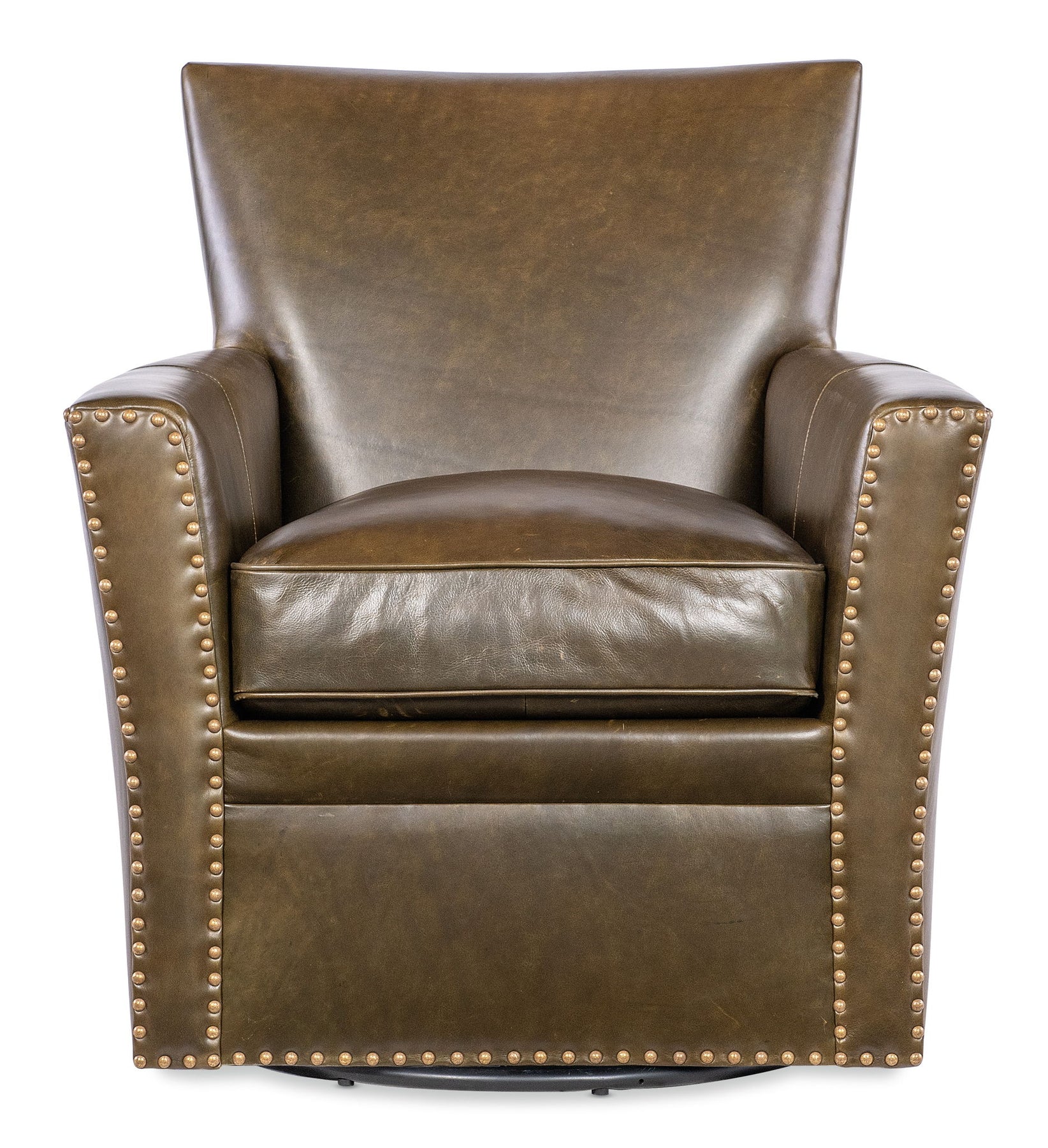 Flared arms outlined in nail head trim combine with a plush loose-seat cushion and luxurious leather cover to create the classic but comfortable Emeral Swivel Chair.