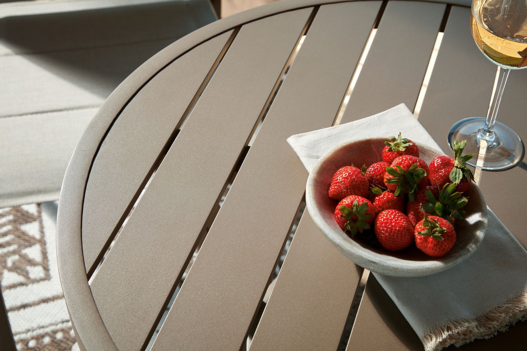 Craft a chic outdoor seating area with this table and chairs set. Outfitted in contemporary neutral hues, it's an ideal spot for sipping drinks poolside or relaxing on the porch. Sturdy aluminum construction and sling seating round out the set with both durability and comfort.
