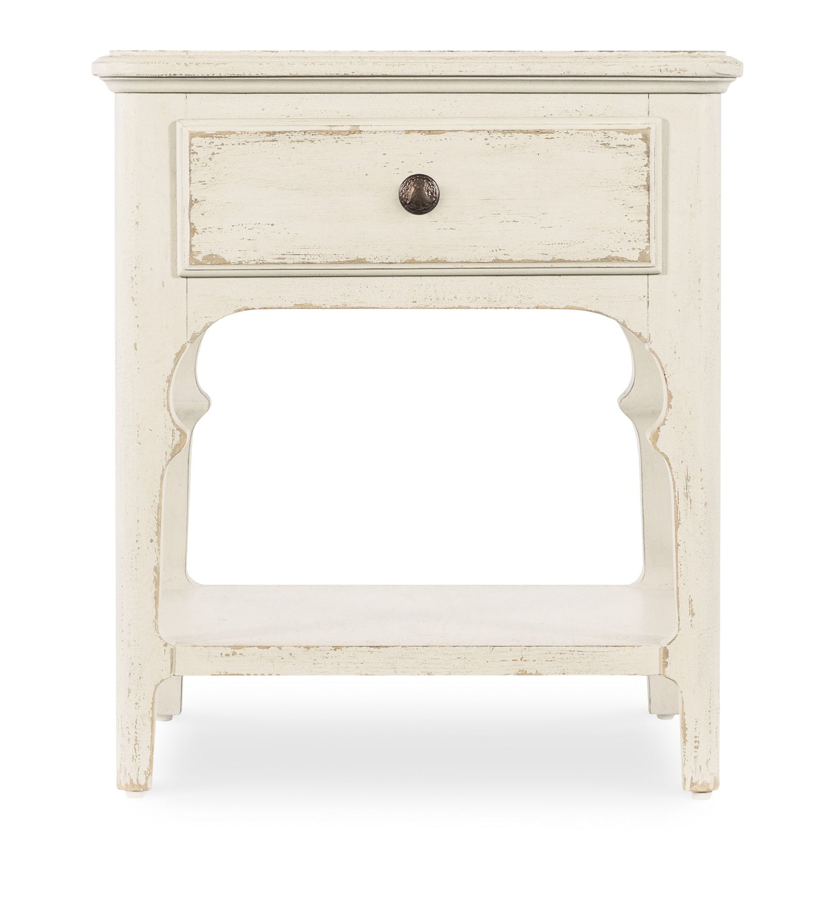 In a classic and clean design with a nostalgic flair, the 26W x 30D rectangle-shaped Americana End Table has turned carved legs, scroll accents in the corners and a planked bottom fixed shelf with an interlocked design that exudes craftsmanship. Made of Oak Veneers with a Solid-Wood Edge Top, it is finished in Honey, a gentle, warm brown tone with distressing that hints at the passage of time, while the smooth surface invites you to run your fingers across it, connecting you with past generations. A metal alloy oval pull in an antique bronze finish adds a final touch.