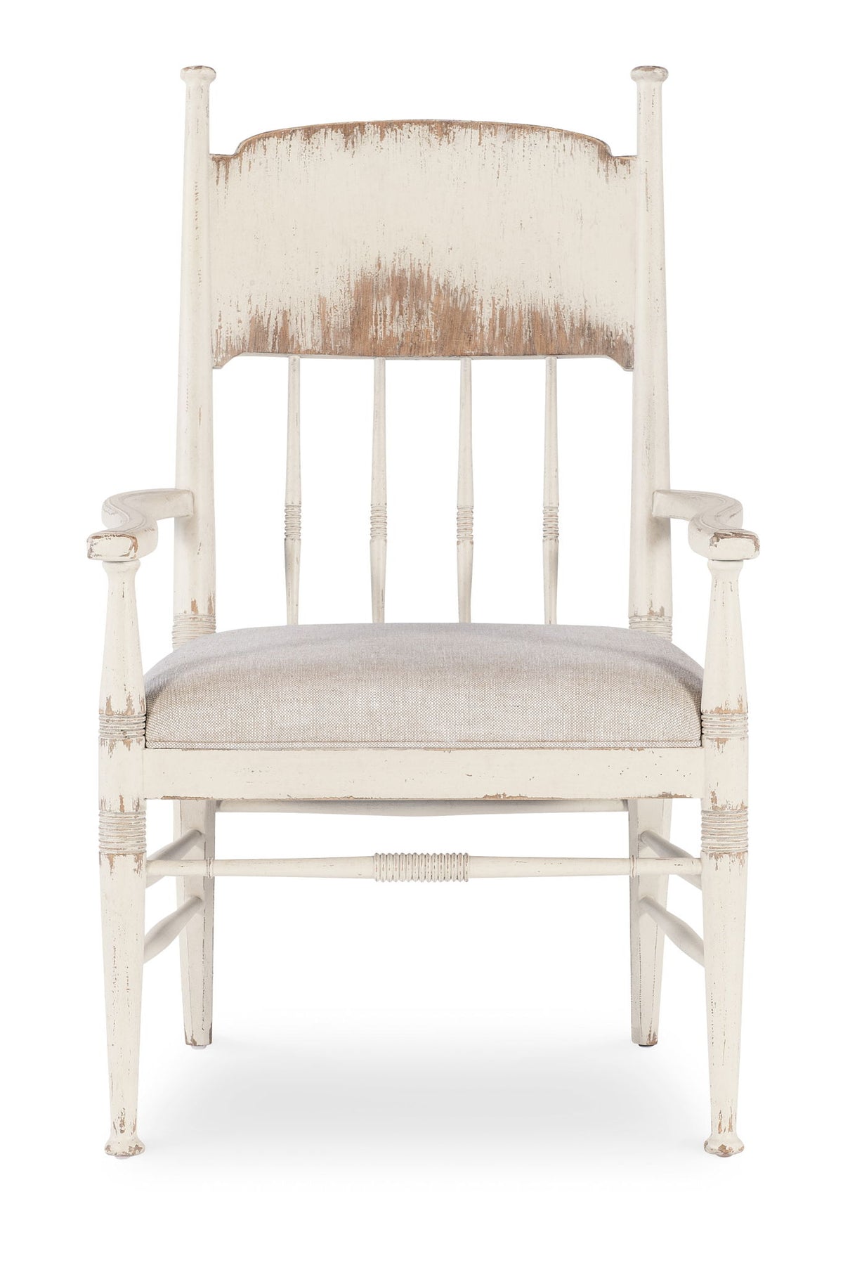 Celebrating the natural beauty of a simpler time, the Americana Upholstered Seat Arm Chair has a spindle back with carved accents on the spindles and frame. Crafted of Oak Veneers with a fabric seat trimmed in welt, it is finished in the time worn finish, with the look of natural wear one might expect of pieces passed down through the family over time, revealing the rich oak character beneath. The seat is upholstered in the 100% Linen performance fabric Biscuit.