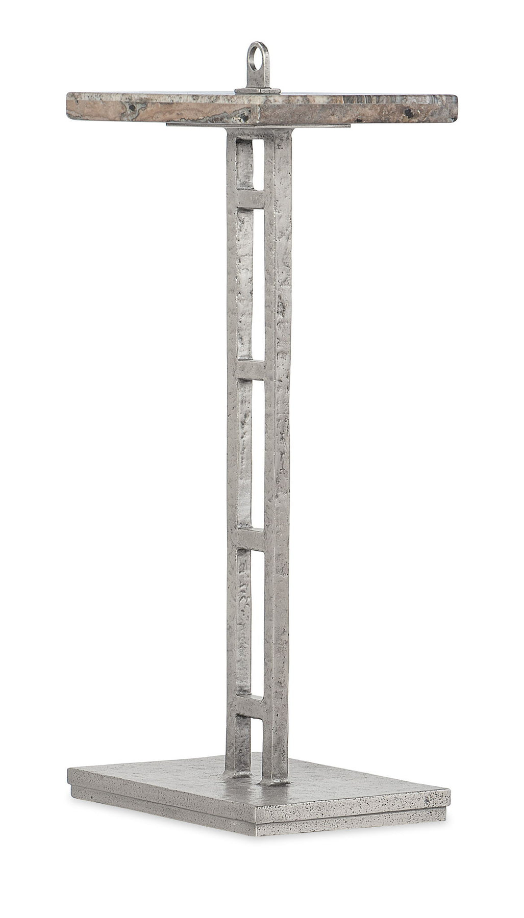 Organic meets industrial in the Chapman Drink Table combining a hand-hammered forged pewter base in a simple geometric design with a honed silver travertine stone top in a compact footprint, making this piece versatile for a variety of spaces.