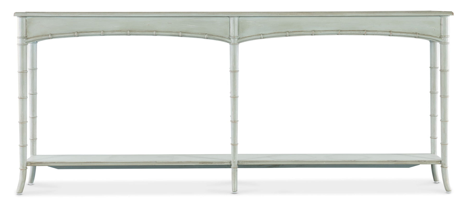 Capturing the vintage charm of the coastal South and the tropical craftsmanship of the West Indies, the Charleston Console Table is crafted of Maple Veneers and Resin with bamboo-motif accents and slender bamboo-style legs. Featuring one fixed shelf, it is finished in the charming Haint Blue, a soft blue color that can be found on the ceilings of porches and entryways, window shutters and doors of the South. The color is inspired by folklore brought to the American South more than 200 years to keep ‘haints’ or spirits, which could not cross water, from entering the home or dwelling.