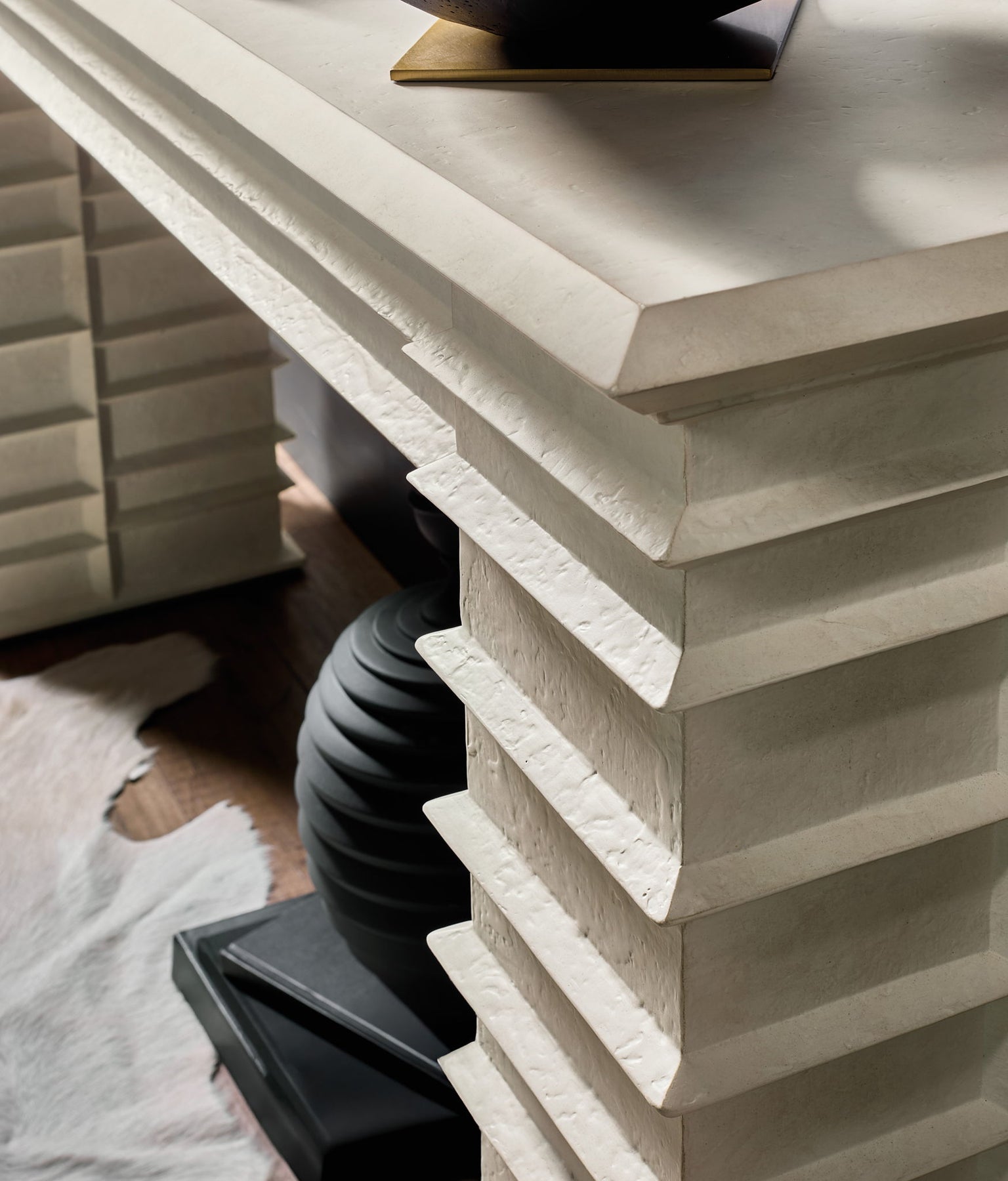 The Melrose Console Table is a statement piece with its textured plaster-like alabaster finish and tiered, ridge architectural design. This narrow console table is crafted from wood and resin, giving it a sturdy structure. The white finish is perfect for bright, airy interiors, while the unique texture and modern design make it a standout in any room. Ideal for contemporary or minimalist spaces.
