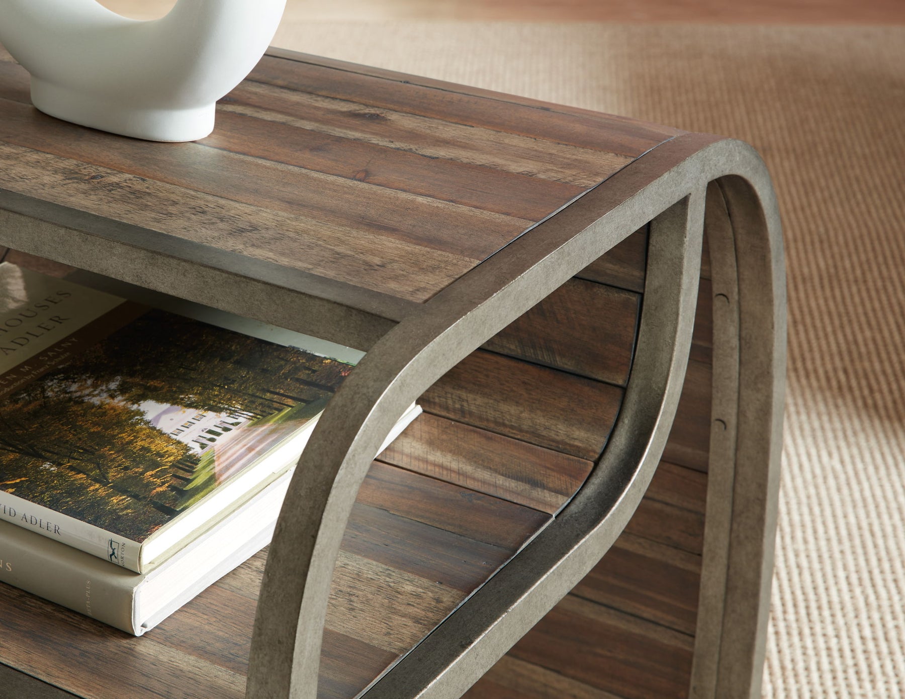 In a dynamic blend of shape and materials, the Open Ended Table combines a pewter metal frame with a planked-wood motif in a natural medium wood finish with distressing and visible knots. The curved design has one fixed shelf and measures 24 inches W by 22 inches D.