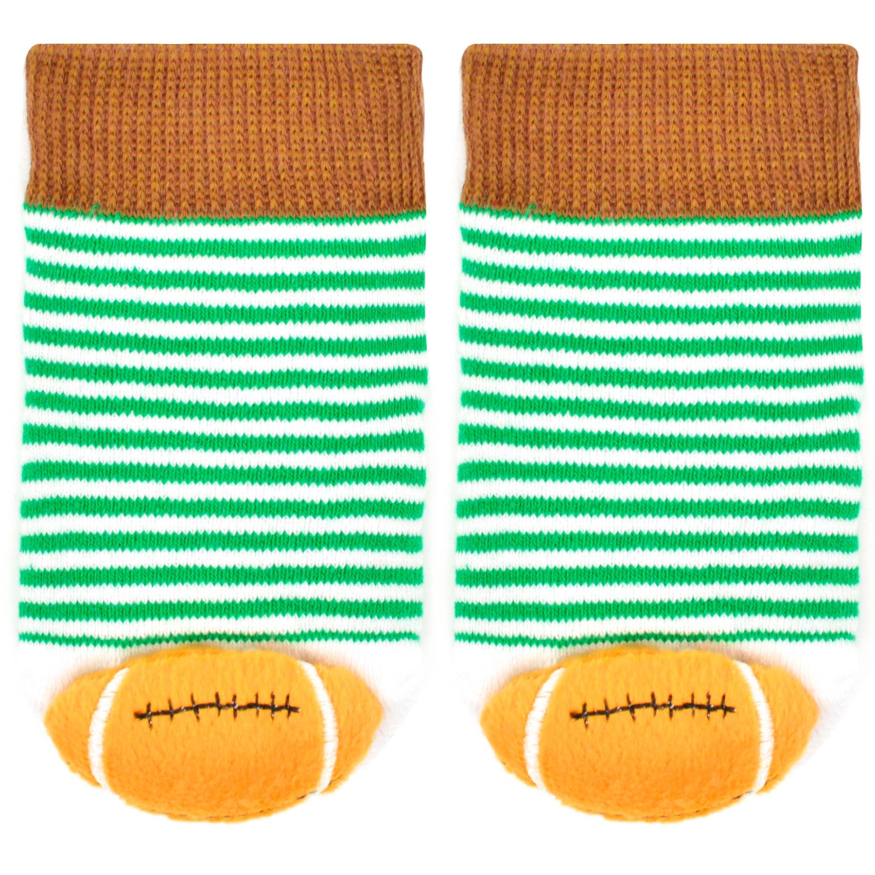 Rubber grip-bottoms provide traction for new walkers and cute little stuffed footballs double as rattles.