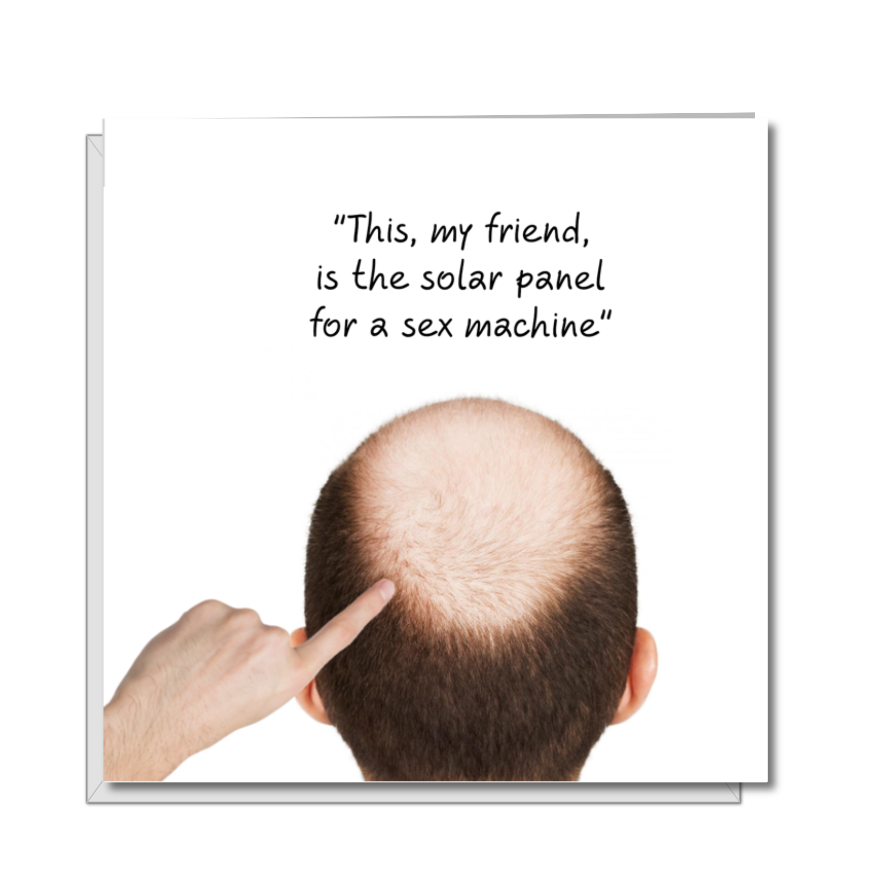 Funny Birthday card for male friend with a bald spot. General-purpose card. Funny, humorous, fun, adult humour. "This my friend is the solar panel for a sex machine" Image: Bald spot with pointing finger. Blank inside for your personal message Handmade blank card printed on high-quality card, complete with envelope. Content: 1 x card, 1 x envelope Size: 6 x 6 inches, 152 x 152 mm Card: White hammer finish, 300 gsm Envelope (included): 100 gsm
