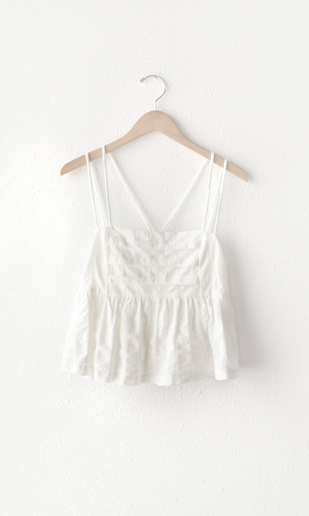 Peplum crop top with a pleated bodice and double spaghetti straps. The fabric is subtly detailed with striped embroidering. Worn well by itself or layered with a light cardigan.