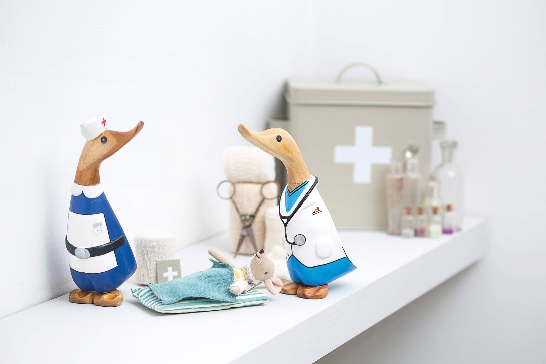 Our everyday heroes, the Paramedic, Doctor, and Nurse ducklings are utterly unflappable. From stethoscope to fob watch, all the details are captured in honour of those who inspired these characters. - 100% unique and hand-crafted originals - Carved from bamboo root - Painted individually by hand - Each Duckling character is approx. 18cm tall - Packed in 10s, 2 Paramedics, 2 Doctors, and 6 Nurses ......