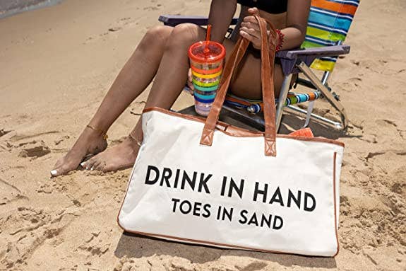 Large Cotton Tote Bag - Drink in hand toes in sand