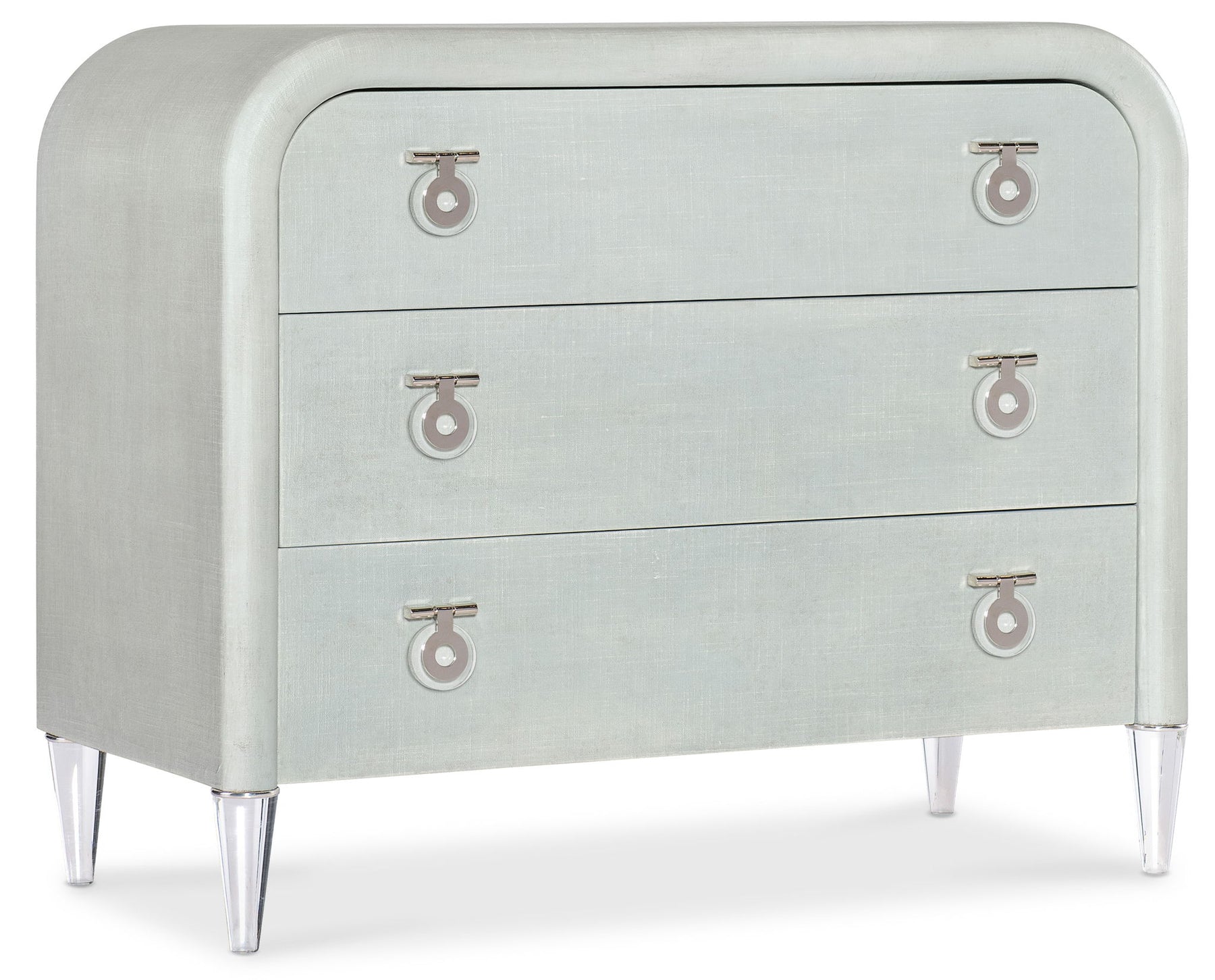 With an understated modern elegance, the Julip Accent Chest is designed with a clean silhouette, clear acrylic legs and metal accents. With a linen-wrapped exterior and drawer fronts and rounded corners, it has chrome-hued, jewelry-like metal drop pulls and three self-closing drawers.