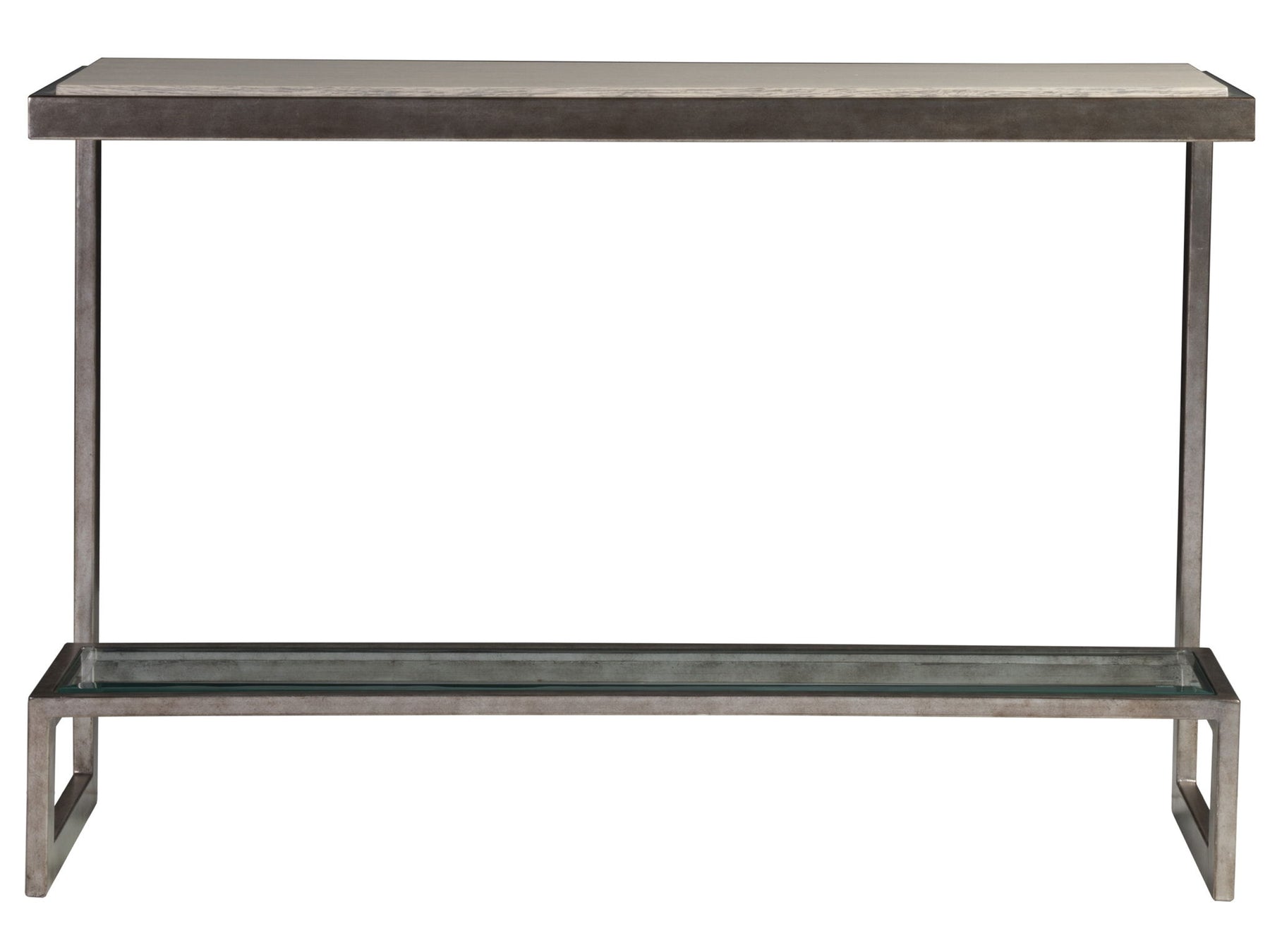 Metal Base In An Antiqued Silver Leaf Finish, Inset Tempered Glass Shelf, Inset Quartered White Oak Top In A Wire Brushed Light Gray Finish.