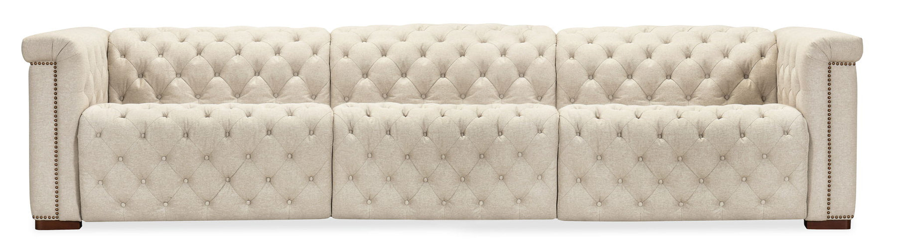 The Savion Deux 3 Seat Sofa offers two power recliners and three power headrests for personalized comfort, all wrapped in the soft Aries Beach performance fabric. This durable fabric, combined with dark wood accents and classic chesterfield tufting, gives the sofa a sophisticated yet versatile appearance. Copper-toned nail trim adds a touch of elegance, while the discreet power recline mechanism ensures luxurious seating for any living room.