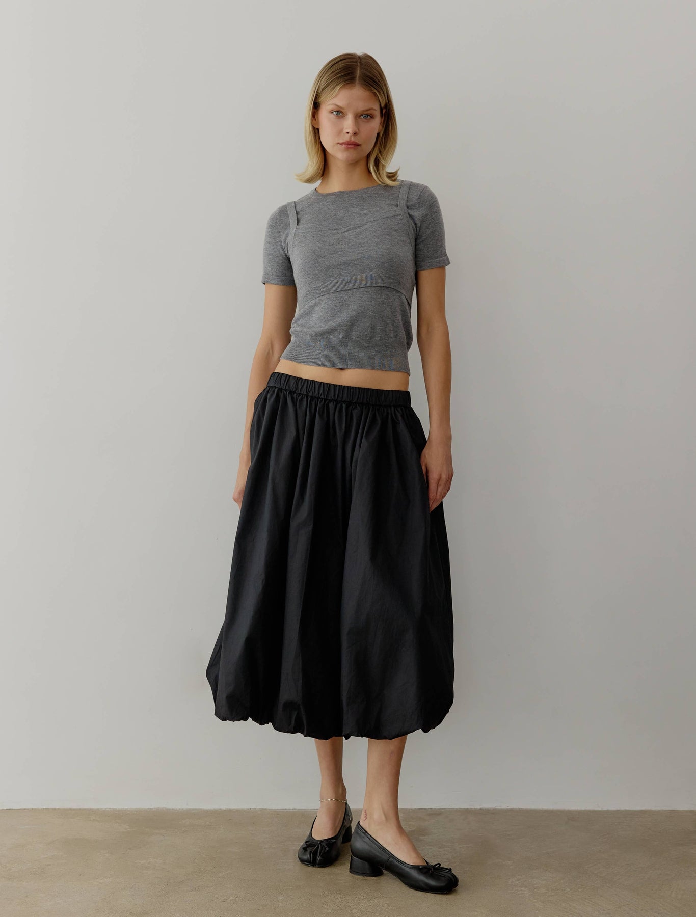 The Bella Skirt is a playful midi-length bubble skirt. It features an elasticated waist for a comfortable and adjustable fit. The length and bubble effect hem add volume and movement to the silhouette. Pair this skirt with a cropped fitted tee and flats for an elevated casual look.