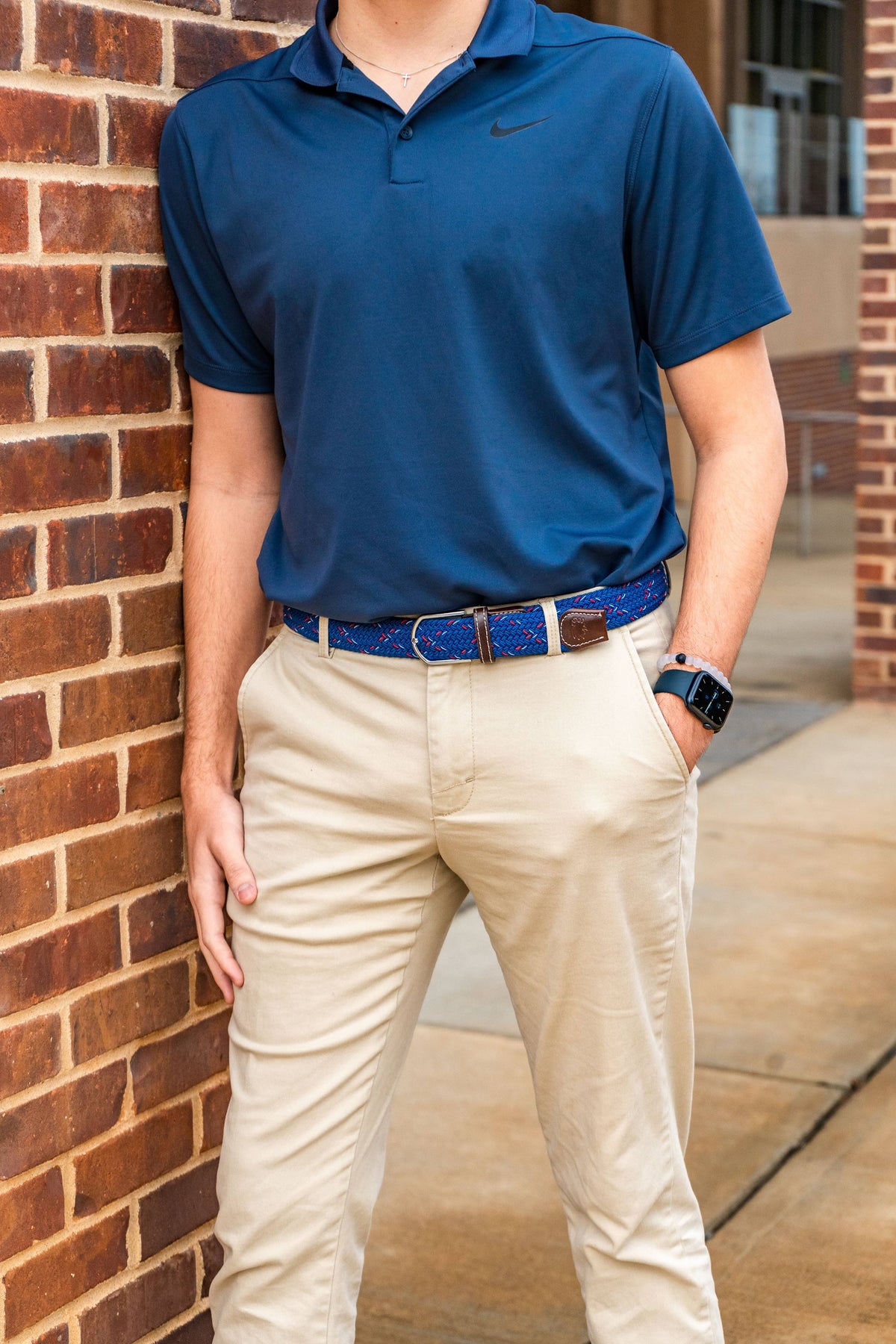 The Coney Island three-toned X-Series woven elastic-stretch belt. Navy, Red and White belt with a rounded buckle and dark brown leather finish stamped with the Roostas logo. An adjustable clasp goes through the woven belt, allowing for adaptable sizing. Designed for comfort both on and off the course.