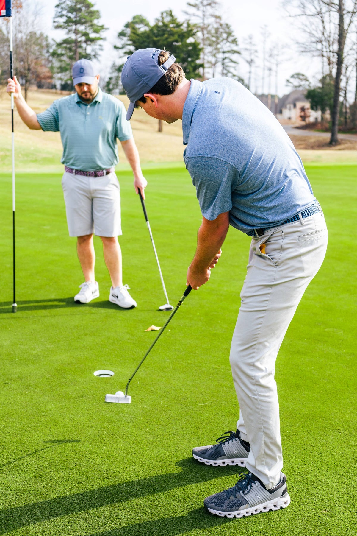 The Nantucket two-toned chevron woven elastic-stretch belt. Navy and Light Blue belt with a rounded buckle and dark brown leather finish stamped with the Roostas logo. An adjustable clasp goes through the woven belt, allowing for adaptable sizing. Designed for comfort both on and off the course. Size Guide: Small: 26 - 32" Waist Medium: 33 - 38" Waist Large: 39 - 46" Waist